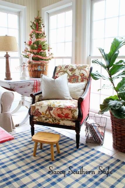 ReplyDeleteOh I cannot wait to see that gorgeous sunroom when I pick up my French treasures!…Love, love, love the chair in the room…it adds so much color and pattern…and you have so many colors to draw from that chair…the perfect Christmas touches to the sunroom…you always do a magnificent job in changing out the decor for the seasons….