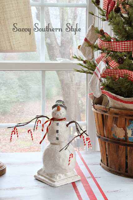 ReplyDeleteKim, I love to see your sunroom during all the seasons, but it really shines at Christmas. I adore that vintage Santa in his sleigh on that wonderful column that displays it so beautifully! But my heart was stolen by that snowman with the red checked mittens standing on that red base! Where, or where did you find him!