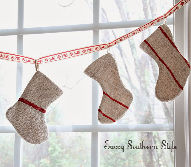 I made this stocking garland with the larger grain sack stockings from On Sutton Place and a piece of Christmas ribbon.