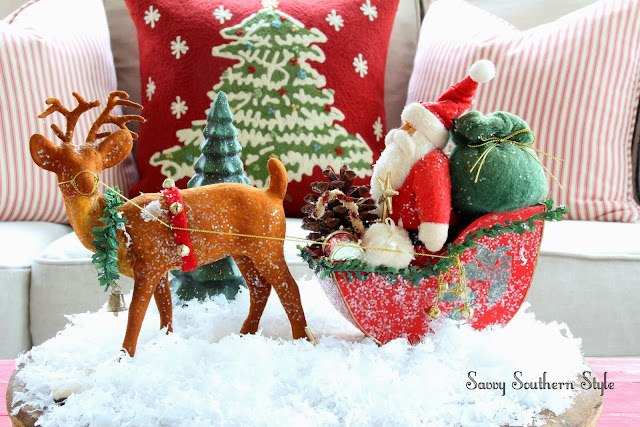 ReplyDeleteAbsolutely love your vintage simplicity and pops of red in the sunroom. My favorite vignette is the Santa sleigh on the base and the adorable snow globe that you made. I have the same holiday ribbon that you used for your mini stocking garland. I've been looking at PB holiday pillows lately, too. I wish I had an outlet close by!!!
